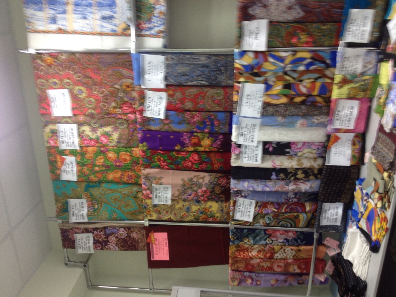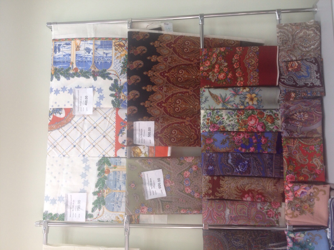 Фото витрин. В мерном лоскуте длина лоскутов небольшая. Шаль Цветущая весна, самый большой лоскут длиной около метра, но обе параллельные кромки срезаны, и есть лоскуты 50-60 см. Платочки такой же длины в лоскуте.