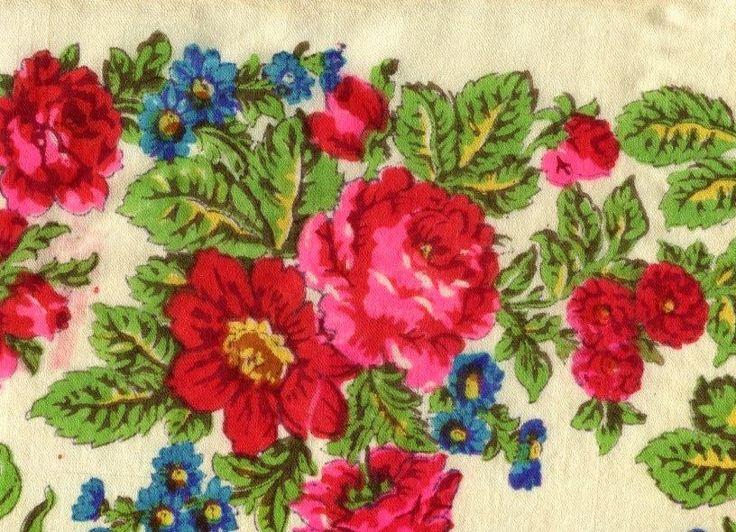 Вспоминаю, как принесла платок домой... Как "ползали" с Юлей взглядом и пальчиками по рисунку (практически не ощущая характерного "сундучного" запаха) и не могли от него оторваться. То, что перед нами платок ручной набойки, поняли сразу. Нашли точки, ниточки, неточности. И это всё было так естественно и живо, будто платок только вчера напечатали. Помню, как бережно его стирала. Какие прочные и надёжные оказались краски...
