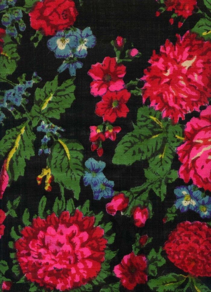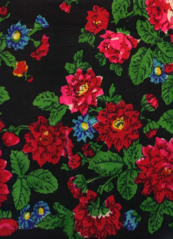 Именно этим я объясняю незначительное количество шерстяных шалей в специальных изданиях, посвященных павловопосадским платкам. Например, у Толстухиной, Полосиновой - только четыре шали иллюстрируют довоенный период и изготовлены до войны - известная шаль со снопами из Русского музея (набитая на хлопке!!!), и шаль Аболихина, рисунок которой мы представляем по фильму "Табор уходит в небо" ( так называемая шаль цыганки Рады), Леопарды и Цветочная кайма (Розы и пионы). Все остальные шали по рисункам довоенной поры представлены в альбоме в образцах ручной набойки 50-х-60-х гг.