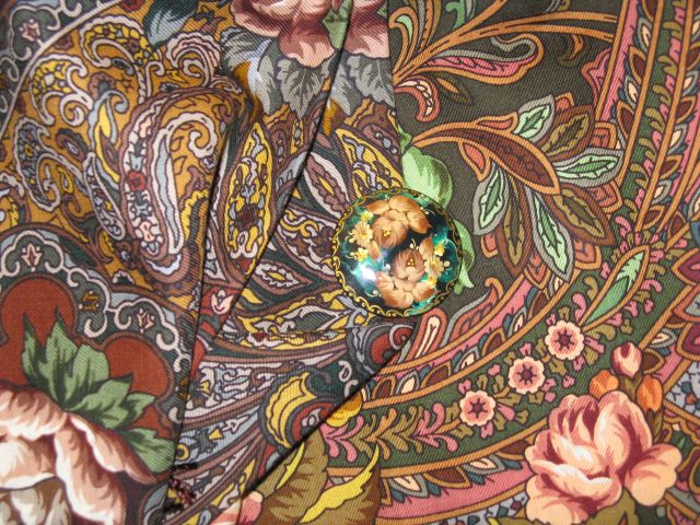 Вот такой старинной заколкой я закалываю шали. Штучка ещё довоенная. Это пока, так как она не ко всем шалям подходит стилистически. Нахожусь в поисках шляпной булавки, но пока не нашла такую, которая бы меня не испугала.