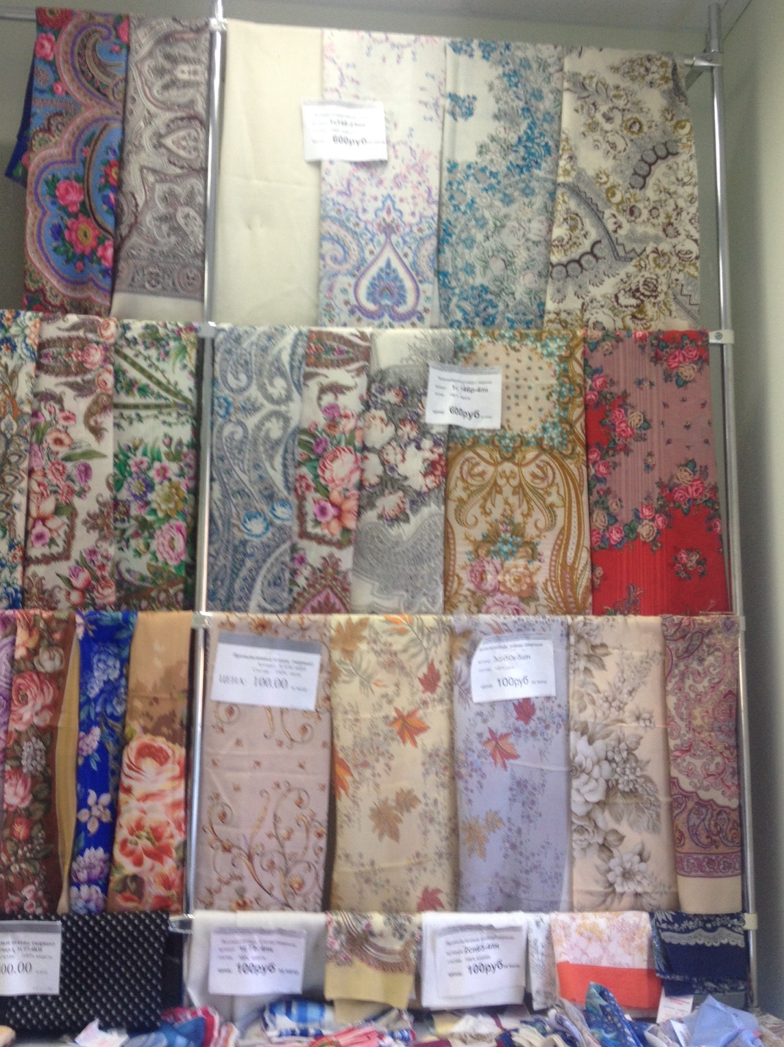 На витрине видно много непрокрашенного лоскута орнаментальных шалей и платков.