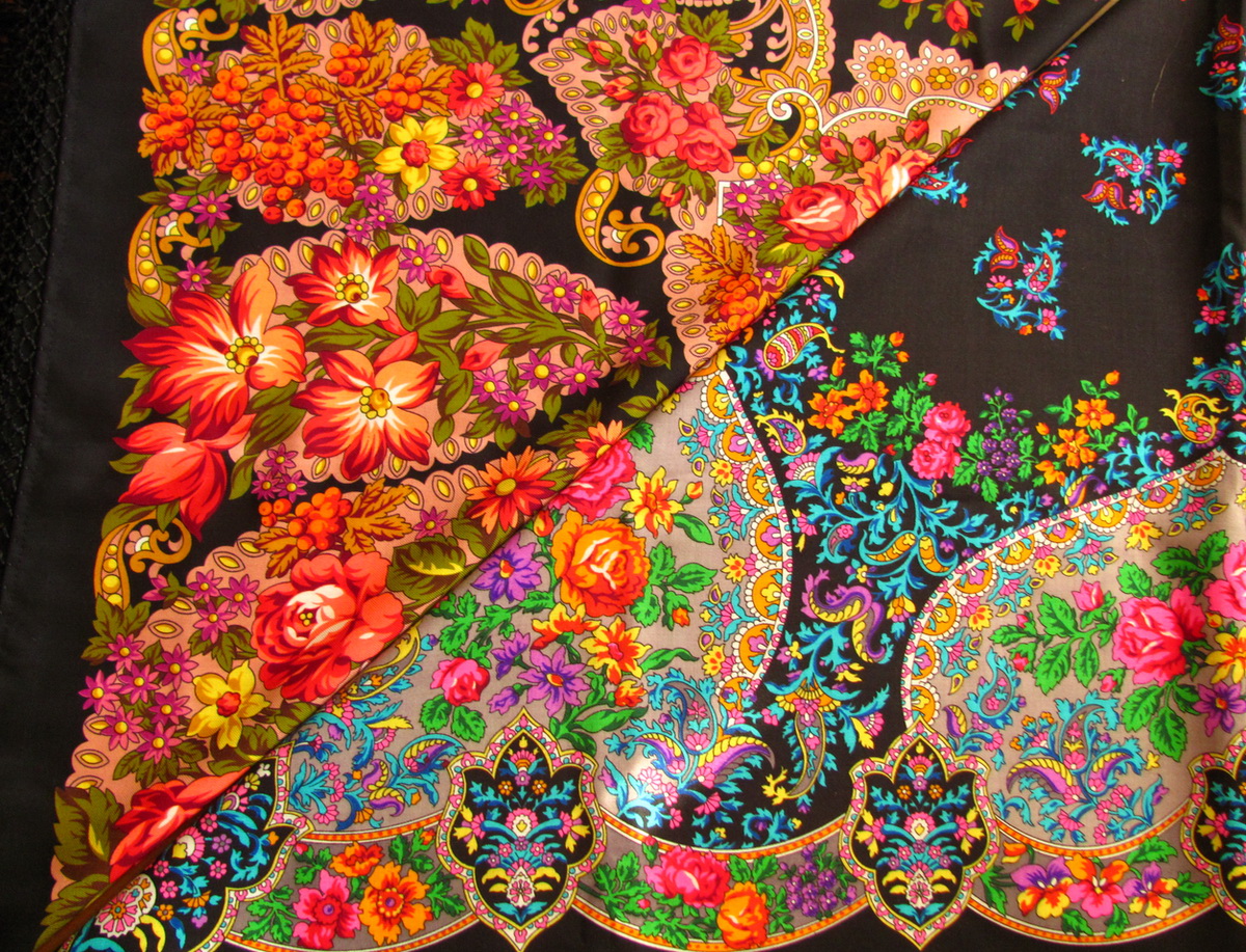 Возможно, платки будут эффектно смотреться вместе, если шелк на голову, а Бархатную ночь раскинуть на плечи на беж коричневом пальто. При случае поставлю эксперимент, о результате сообщу :)