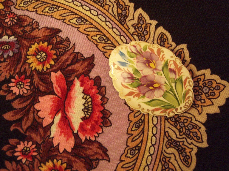 Здравствуйте! Хочу показать купленные на "Вернисаже" в Измайлове брошки для платков. Старалась соблюсти "цветовое и стилистическое соответствие" подбирая изделие под платок.