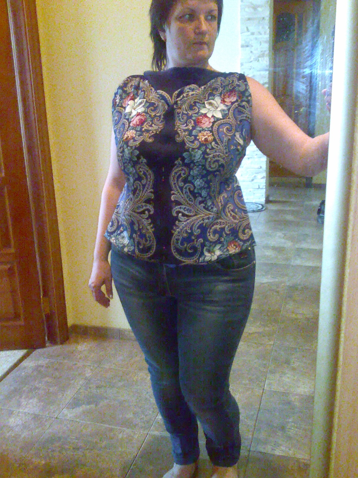 Потом жилеткой озадачилась. Цветы к лицу понравилось больше, чем вниз. Там их, в нижней части не видно, а у лица синие гирлянды туслкые и лицо тусклое. Лоскут сначала на трикотажный дублерин посадила, потом кроила. Практически из лоскутов,как пэчворк собирала. Поклад - плащевка на флисе.