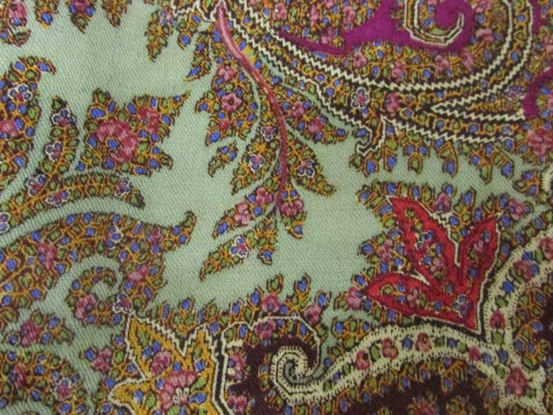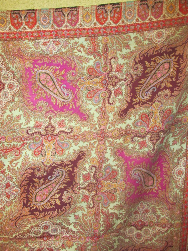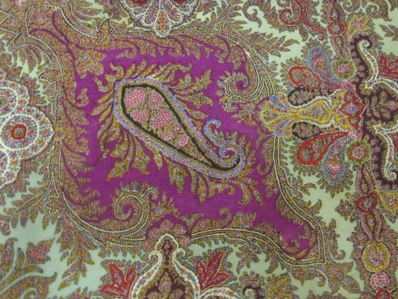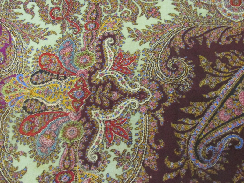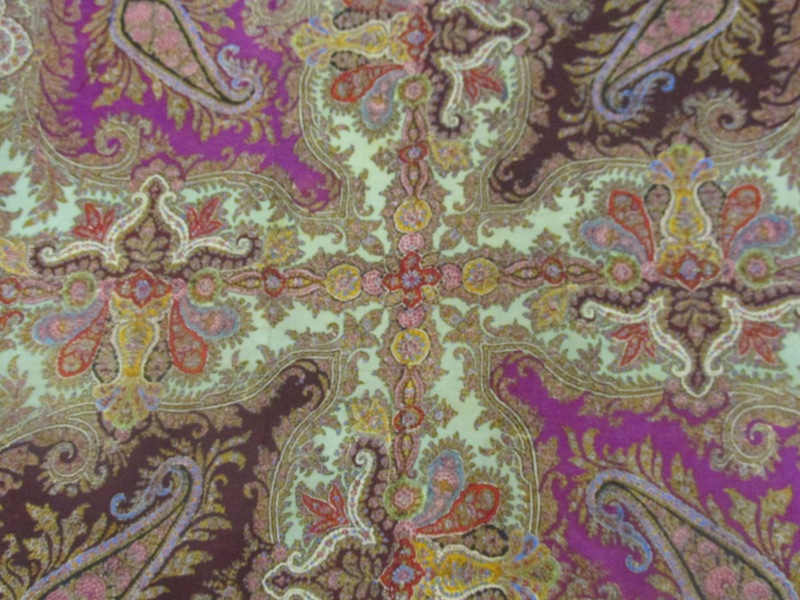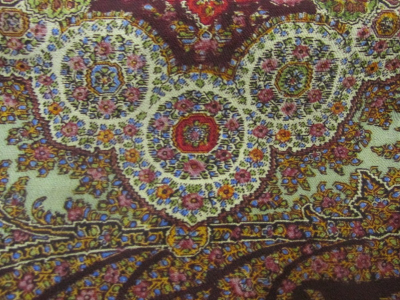 Ткань плотная, плохо драпируется в качестве платка. Размер: 144 см. Лично в руках эту вещь не держала, поэтому не могу точнее описать. На увеличенных фото можно рассмотреть переплетение нитей и контур элементов рисунка, выполненный не плавными линиями, а квадратиками, видимо для эффекта вышивки.