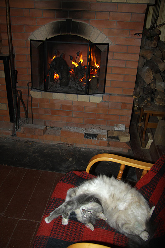 Я все еще на даче, очередную стройку затеяли, поэтому камин не роскошь, а средство отопления, плюс печки конечно, дом большой, топлю и топлю. Покажу свою Азю, с наступлением холодов она облюбовала кресло около камина, в печку во время растопки тоже пыталась заглянуть, к моему ужасу потереть нос о горячую дверку печки. Не боится огня, странно для зверя, в камине трещит, иногда стреляет, жаром пышет, а она спит пузом вверх и в ус не дует.