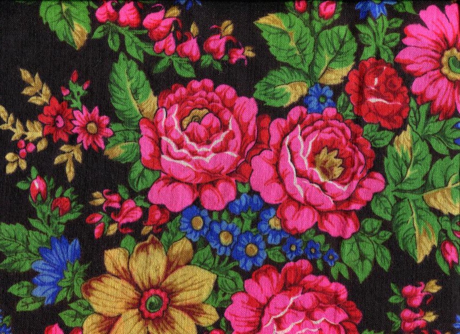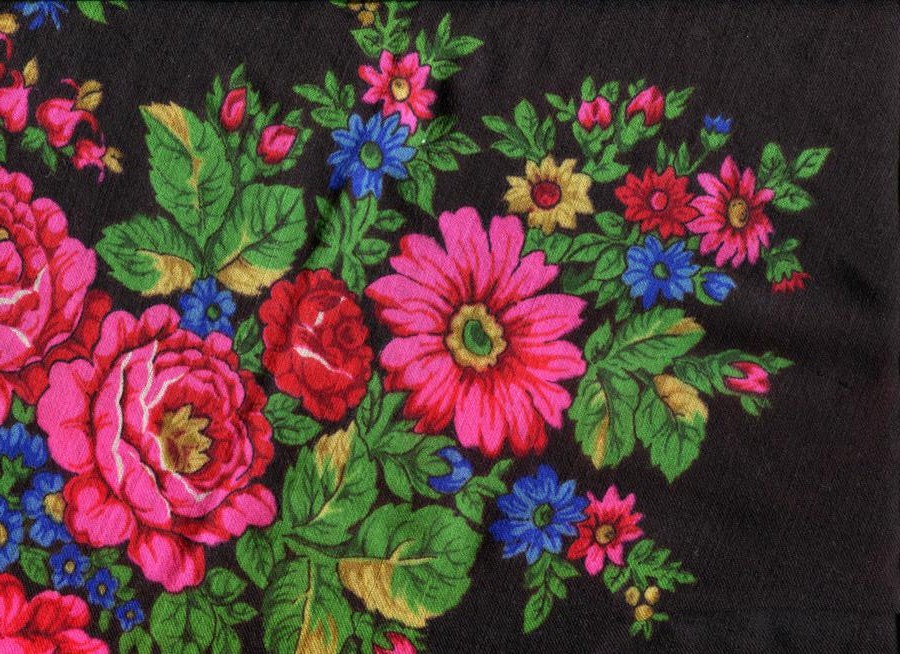 Как трудно бывает отойти от стереотипа. Долгое время между собою мы считали этот платок украинским, и вот теперь Ирина Петровна его опознала как шаль по рисунку Ольшевской! А посмотрите крок их детской художественной школы и сравните с узором шали Елены. Как же они похожи - по отдельным цветочным элементам, манере изображения крупных цветов! Вобщем, мой стереотип рухнул! А как аккуратно напечатана шаль - чудо!