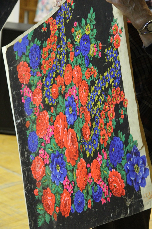 Как трудно бывает отойти от стереотипа. Долгое время между собою мы считали этот платок украинским, и вот теперь Ирина Петровна его опознала как шаль по рисунку Ольшевской! А посмотрите крок их детской художественной школы и сравните с узором шали Елены. Как же они похожи - по отдельным цветочным элементам, манере изображения крупных цветов! Вобщем, мой стереотип рухнул! А как аккуратно напечатана шаль - чудо!