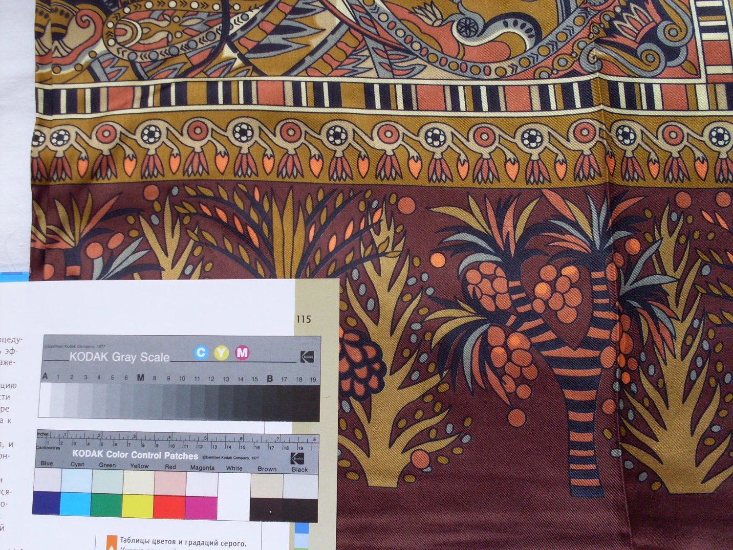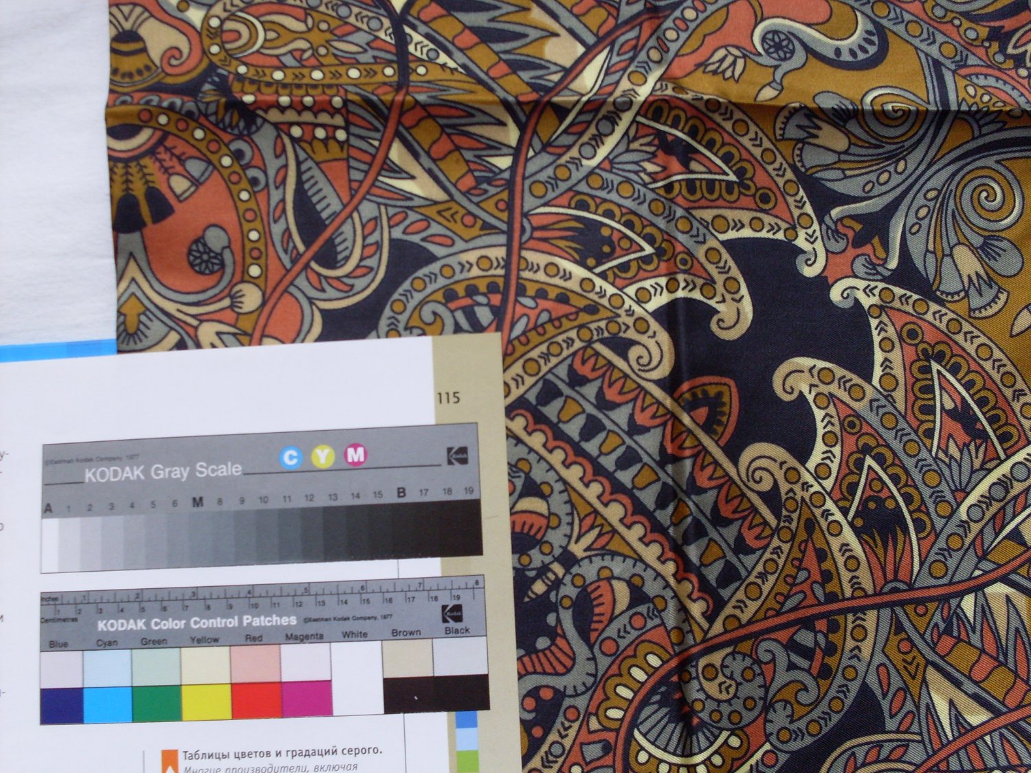 Platki, KittiFE спасибо за обсуждение и ваши мнения. Мне все-таки интересно, если убрать излишнюю синеву, как вы считаете, неужели черный низок станет серым? а кирпичный цвет - красным. Насколько я понимаю - при добавлении синего красный становится малиновым или фиолетовым в зависимости от соотношений цветов. Поэтому вывод я думаю один: цвета на платке не соответствуют цветам на картинке. Может был другой платок, может ещё какие-либо причины. Но в данном конкретном случае это так. Я выкладываю ещё фото со шкалой, мне они сначала показались не передающими цвет, но судя по сравнительной шкале, приведенной Platki, они подходят больше. Ещё раз прошу вас посмотреть на них. Что-нибудь изменилось в цветовой гамме платка? Кстати фото эти сделаны другим фотоаппаратом.