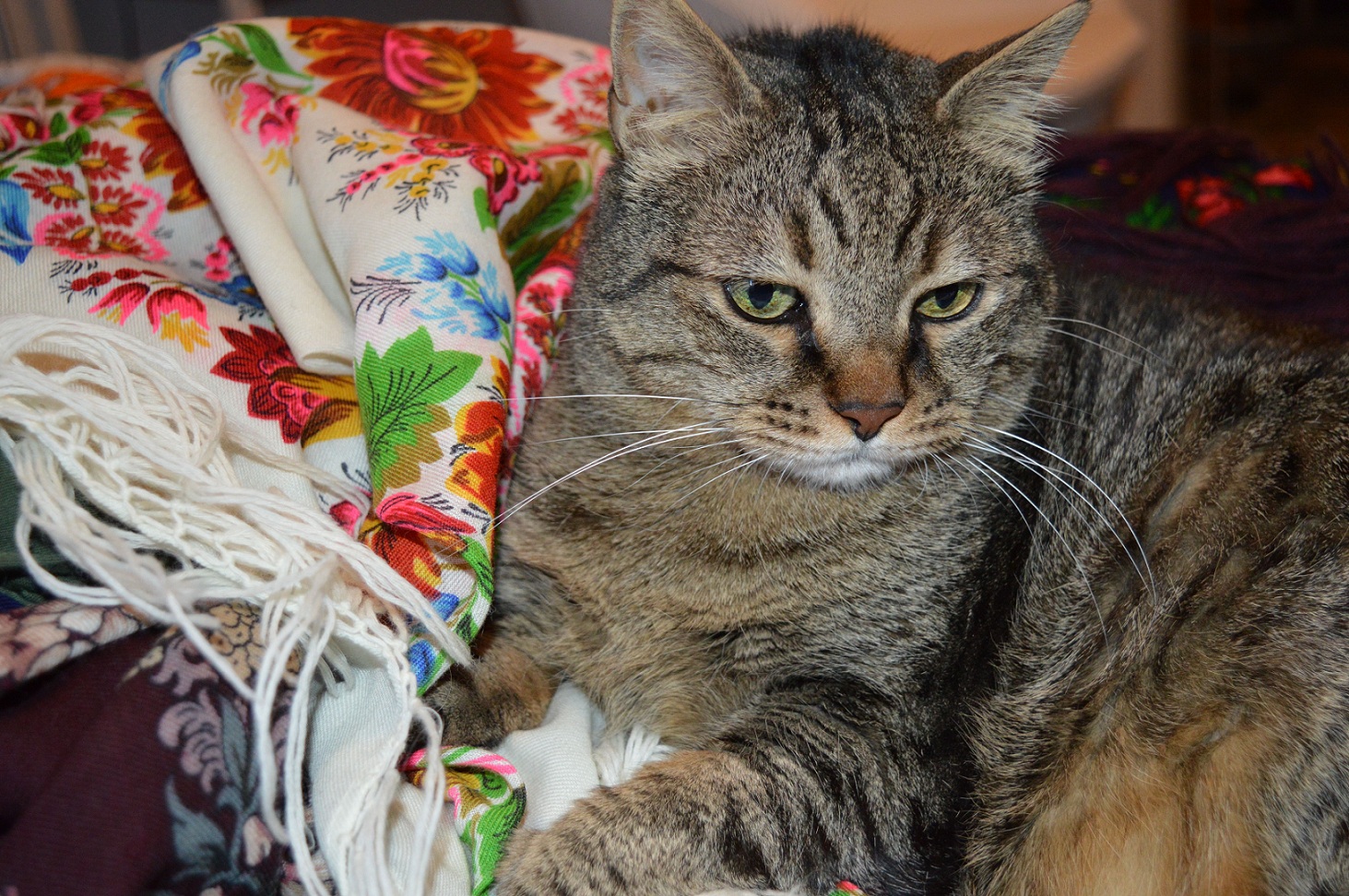 Хотела снять в подробностях чудесный украинский платок в стиле петриковской росписи, но кое кому он тоже приглянулся. Так что теперь мне в тему "Мой зверь"