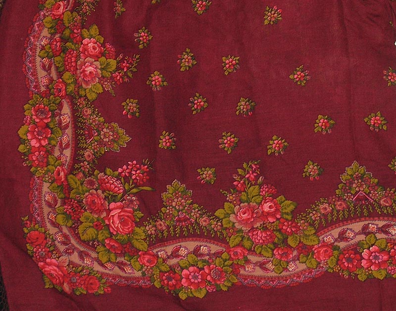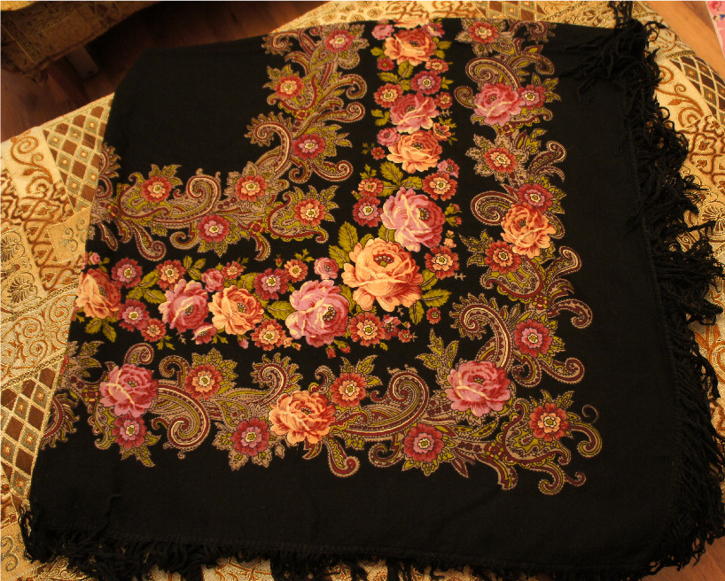 Принадлежит моей двоюродной сестрице. Стирана и не раз, но узор по-прежнему четкий. Покупала она ее в конце 1980-х - начале 1990-х годов (некондиция, с одной стороны кайма отсутствует). На фото цвета выглядят несколько теплее, чем в реальности.