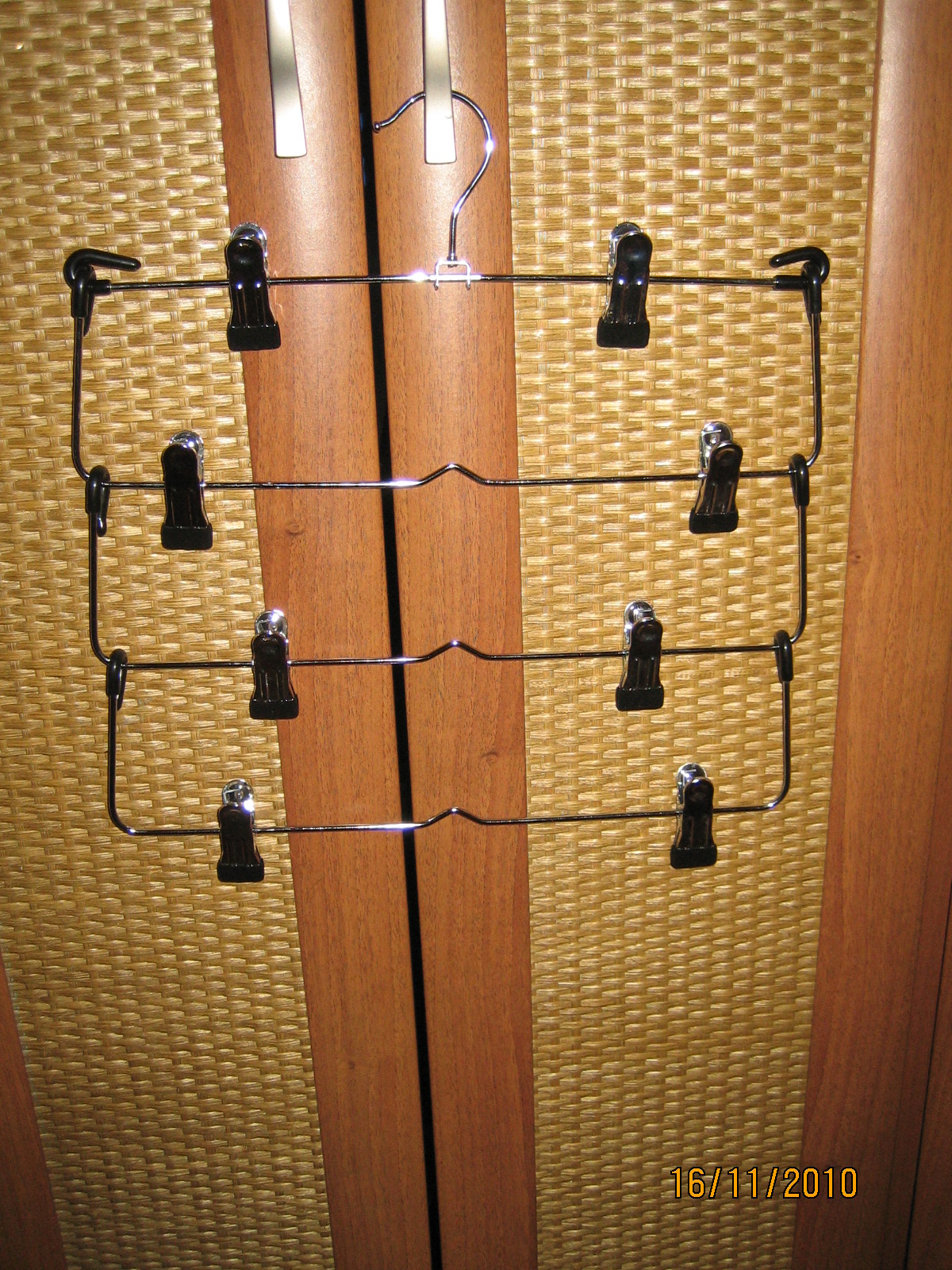 Вешалка называлась для брюк и юбок. Там 4 уровня, ширина зажима регулируется, а сам зажим жеский и прорезиненый (не оставляет следов). На один уровень я размещаю 2 платка (шали повыше, платочки пониже, а там как место позволяет), но можно и 3 шт. Таким образом на одной вешалке можно разместить от 8 до 12 платков (можно и больше). Подвесные секции подвижны. Платки висят наглядно, не надо снимать все, чтобы достать необходимый.
