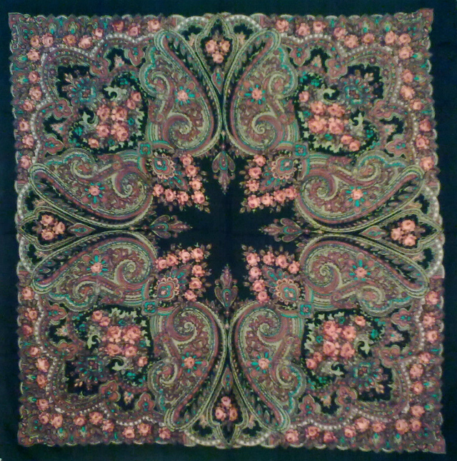 Ларисочка, вот платок БС 1165 - образец рисунка на хлопке, близкий к Вашей шали. Средник оформлен по другому, а в остальном полное совпадение. Думаю, хлопковая шаль служила исходником для рисунка на Вашей шали.