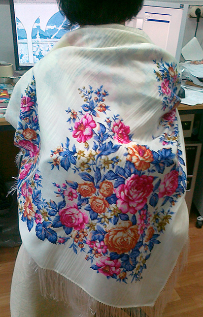 Получила синий "Шафран". Очень красивый синий цвет в средине платка, и он совсем не виден при ношении на плечах или шее. При носке на голове к лицу все равно попадают углы гораздо более мрачные, синий там чуть, в проблесках, и теряется.Получается, удачнее всего он просто в развернутом состоянии. Как была бы красива кайма такого роскошного синего цвета! Нет ли в планах перераспределить цвета и сделать варианты?