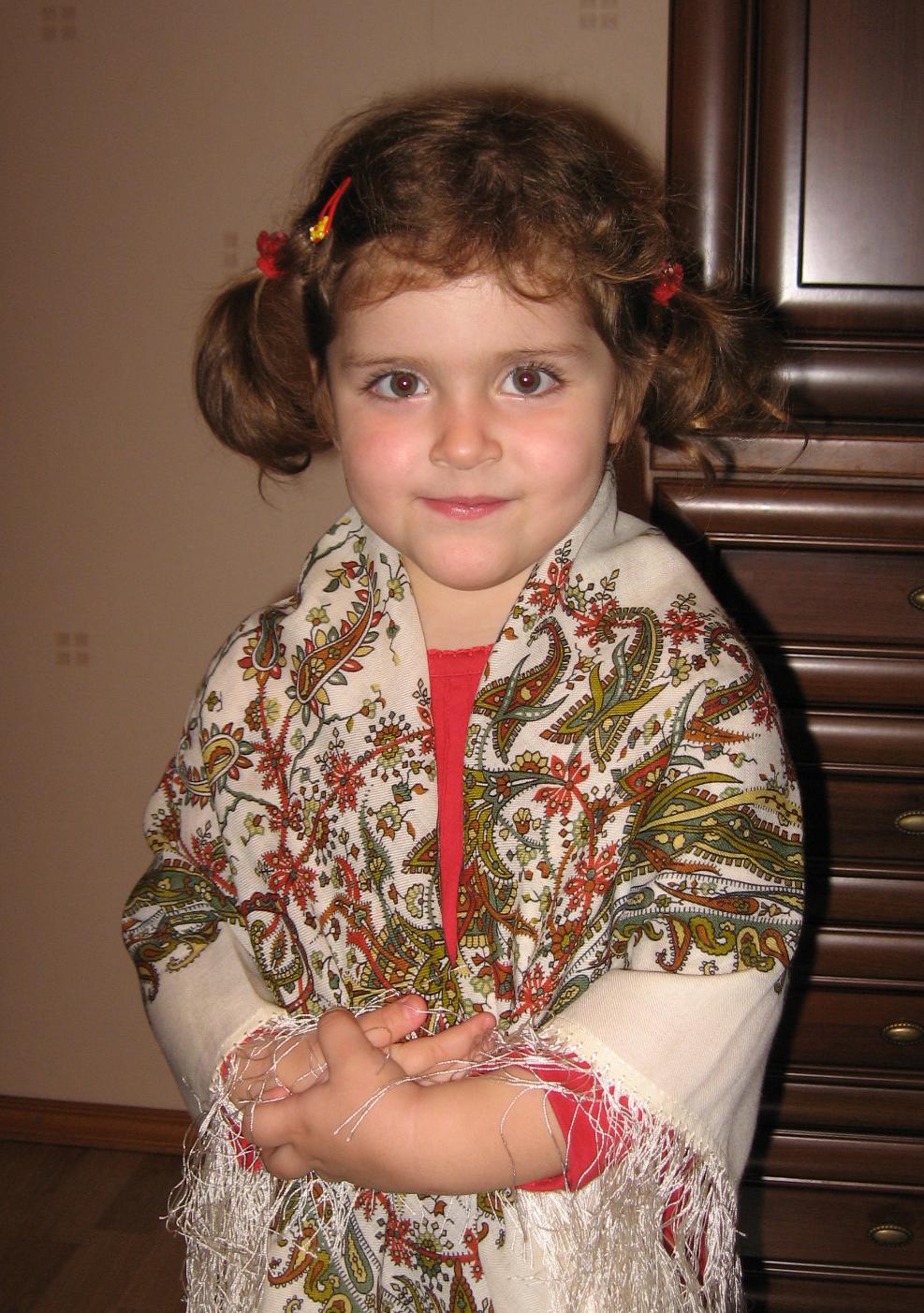 Сегодня покажу дочку, ей скоро три годочка. Маленький Балаганчик она давно считает своим платочком, я его никогда одеть не могу. А тут недавно я получила посылочку с распродажными платочками, разложила их и спросила дочку какой самый красивый? Анютка выбрала Русь и заставила меня повязать на ней шаль. Теперь Русь тоже её платочек. Кто-то сетовал, что шали размером 148 не на всякий рост подходят. Анютка ростом 1метр, и ей шаль не кажется большой.