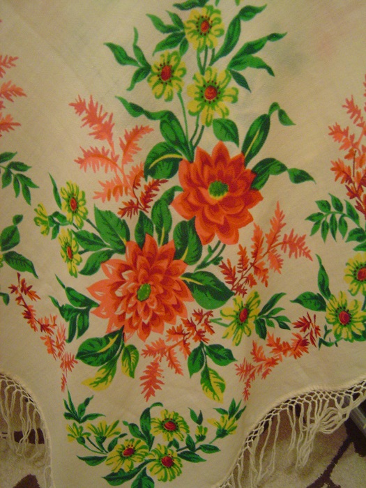 Размер 135*135, черное поле, плотная ткань(даже очень) бахрома в 5 рядов, орнамент: бабочки, белочки, птички, венок из хризантем красивый до безумия. ^a
