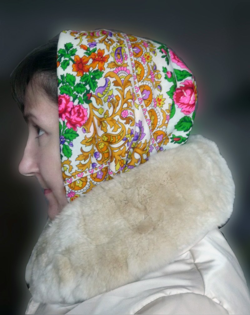 Янетта, спасибо ^% . Да, вы правы, платок завязан традиционно, один конец обвязан вокруг шеи и закреплен, а второй выпущен наружу. И немного сдвинут платок назад, потому как сейчас тепло, а зимой придется поосновательней повязывать. :)