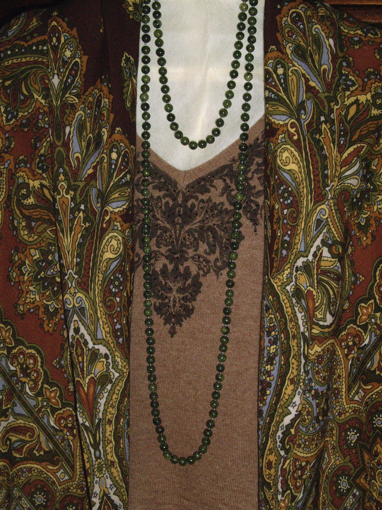 Вот "Ларец самоцветный" (вместо белого открытая шея, конечно), сюда еще коричневые брюки или юбка (цвета рисунка на свитере) С тем же свитером "Фламенко", вот только бусы заворачиваю в три ряда, чтобы все на теле оказались.Сюда еще брюки цвета кофточки с третьего фото или юбка бархатистая чуть зеленее. "Фламенко" часто ношу с этой кофтой и с брюками того же цвета. Бусы, правда, на последнем фото зря эти повесила (не одевала так никогда). К этому комплекту недавно более подходящие появились из сердолика. Когда про них вспомнила, уже весь комплект разобрала, стало лень опять одевать.