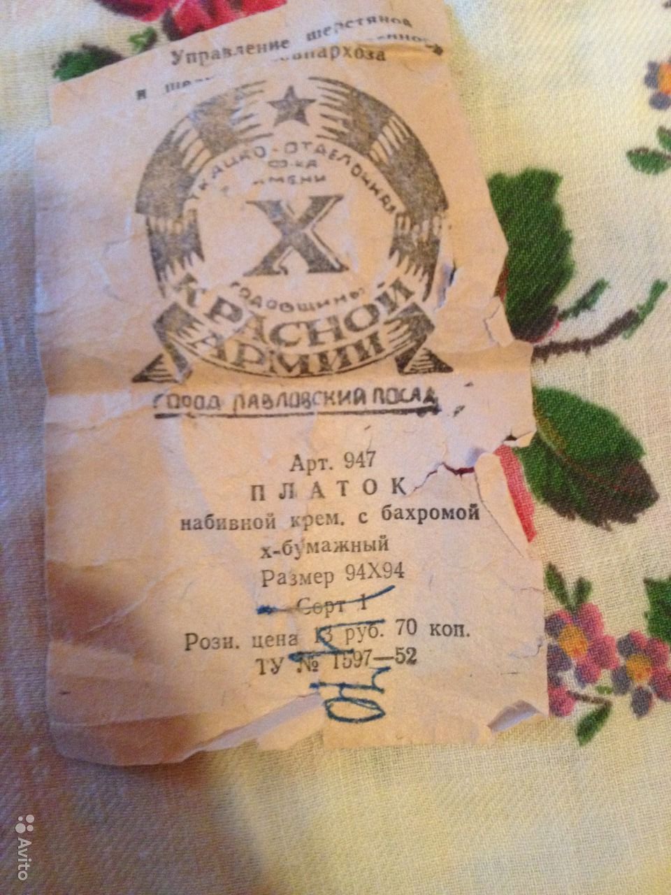 Розовая этикетка крепится к платкам стандартного (более низкого, чем первый) сорта. Красочная этикетка к ним не крепится. Бумажка с цифрой 7 - не оторванная метка швеи (под наклейкой) и бахромщицы.