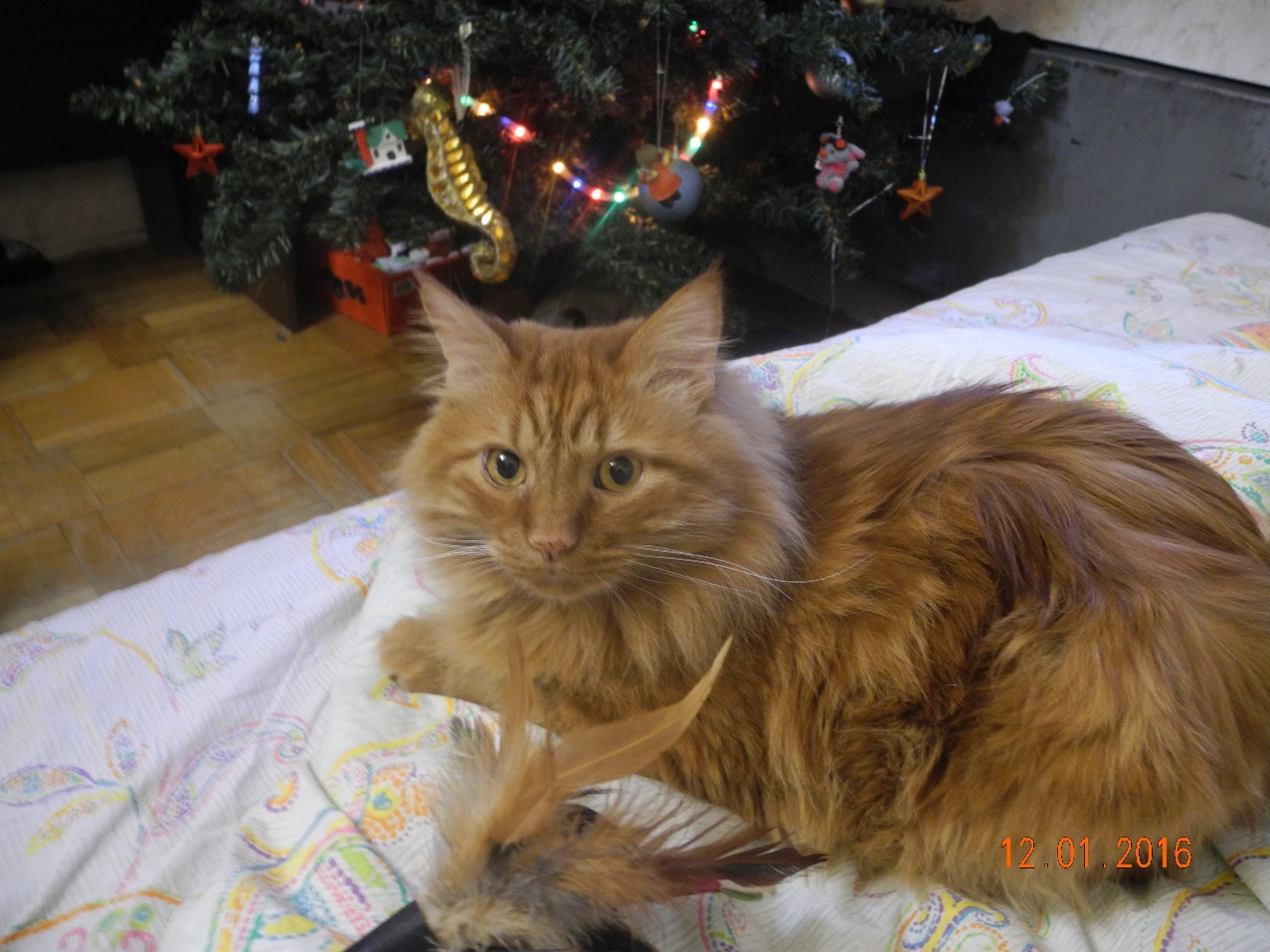 Убиралась, переставила временно елку пониже, а зверь тут как тут: что там за фигня под елкой намотана?