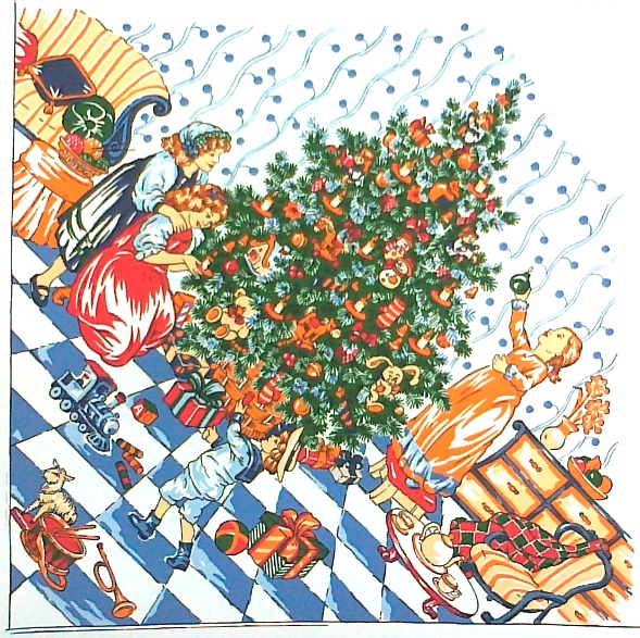 К новому году готовим славную скатерть. По углам будет изображена сцена наряжания елки. По кайме - зимние пейзажи за окном... по середине - редкие веточки-шарики.. чисто новогодняя. на льне.