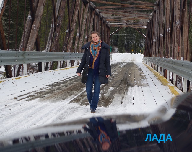 Вот такой был мой вчерашний образ. Опять дорога, машина и платочек вокруг шеи. Прохладно в машине. Сижу как нахохлившийся воробей. Теплый платочек - необходим. А вот таким был образ на той неделе. Остановилась как всегда у мостика. Уж очень он интересный.