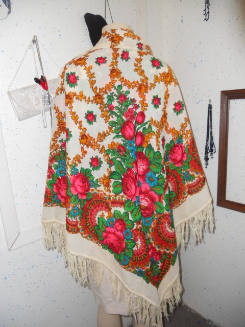 Меня смущают все эти детали "немного чересчур" -- "веера" по краю, гирлянды золотых листьев по среднику... Шаль, говорят, старая, тоже 30-40 лет якобы.