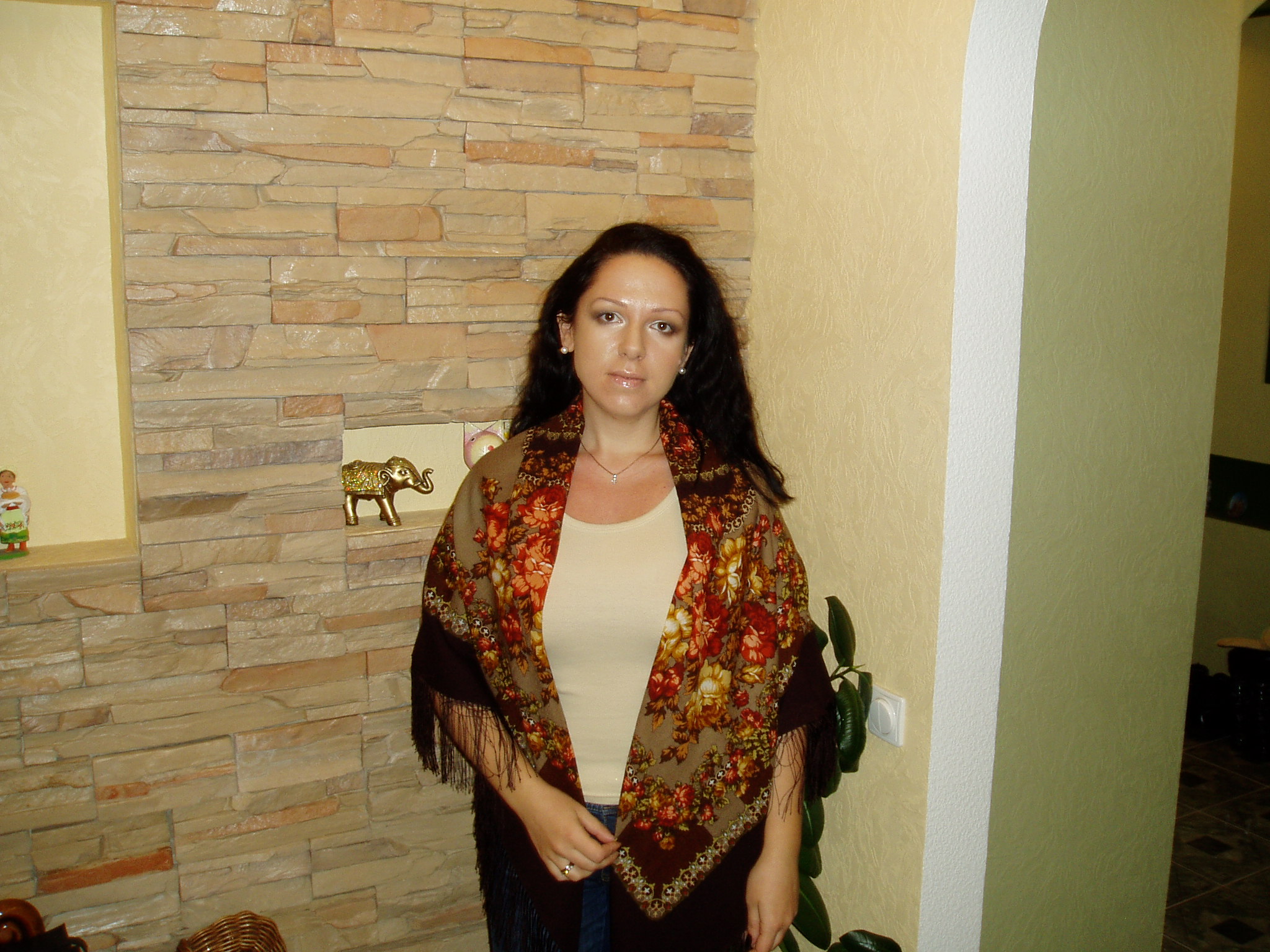 Я тоже платочек покажу :) Вынула его из шкафа и увидела совсем по-другому, чем сразу после покупки. Красавец же просто! Покупала летом, и от такого жаркого колорита даже дурно делалось, а теперь любуюсь - не налюбуюсь. И огонь в камине, и осень красно-золотая, и кисти рябины (хоть там её и нет:)).
