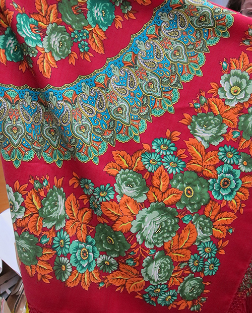 И шелковый шарфик с классическими павлово-посадскими цветами в исполнении Натальи Белокур.