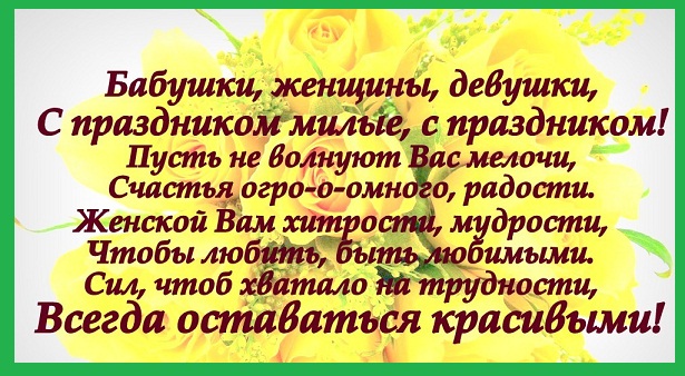 Прекрасные Женщины/Девочки/Девушки/Дочери/Жены/Мамы/Бабушки, Добрые, Умные, Нежные, Достойные, Очаровательные, Вдохновительницы, Музы, Беатричи, Лауры и Джоконды, Хранительницы, Оберегающие, Заботливые, Могущие все, Умеющие всё, конянаскакуОстановительницы, Великолепноборщварительницы, Лентяйки и Активистки, Спортменки и Йогини, Комсомолки и Беспартийные, Опора мира, да просто - Красавицы и Богини - с ПРАЗДНИКОМ НАС!)))))))))