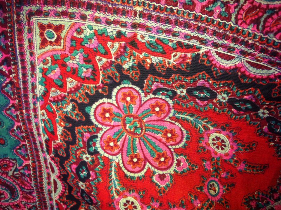 А мне попалась шаль, не знаю кто напечатал, надеюсь ППМ, и какого времени, ручная набойка, уплотненка. Не смогла найти в архиве...