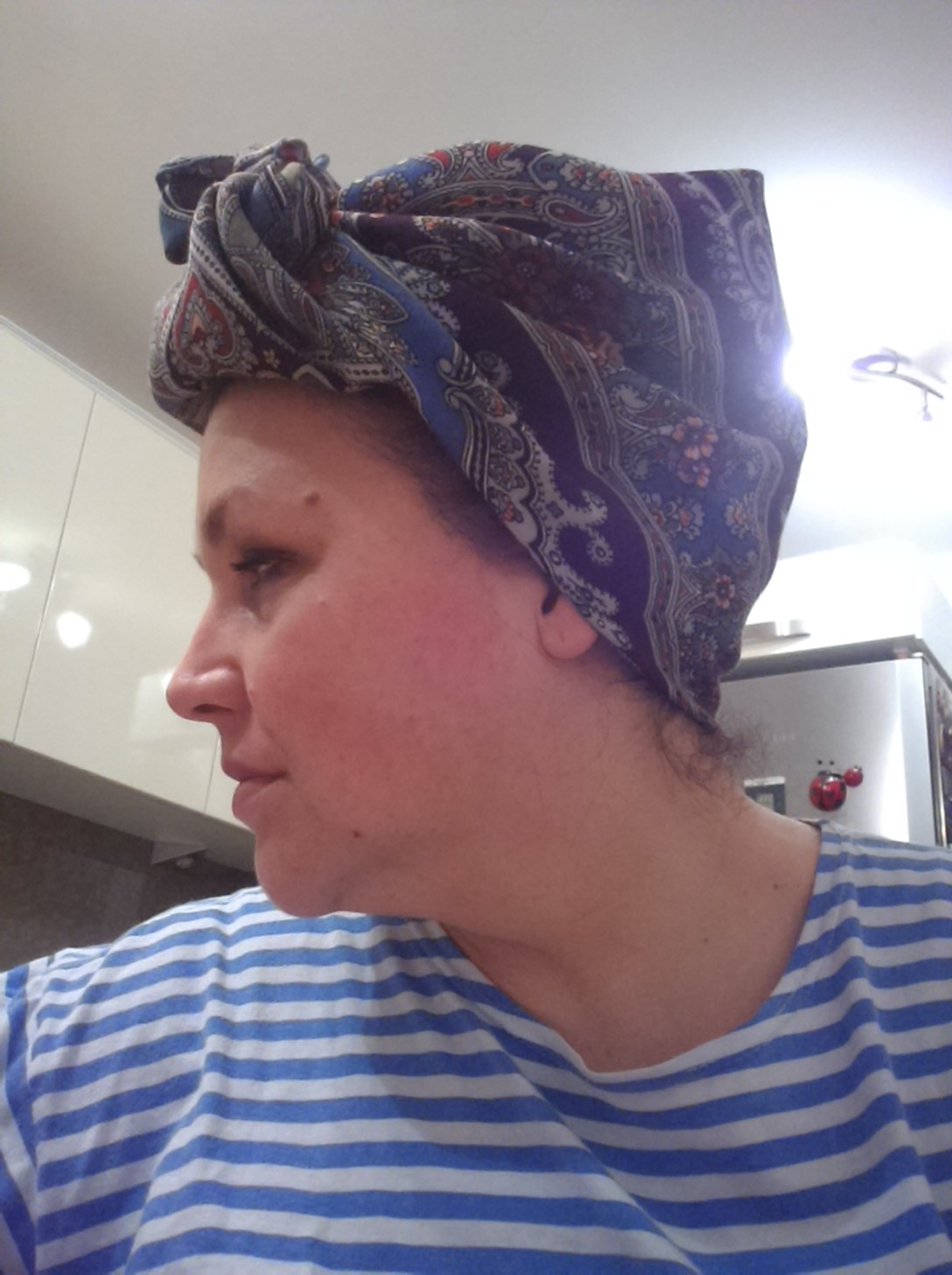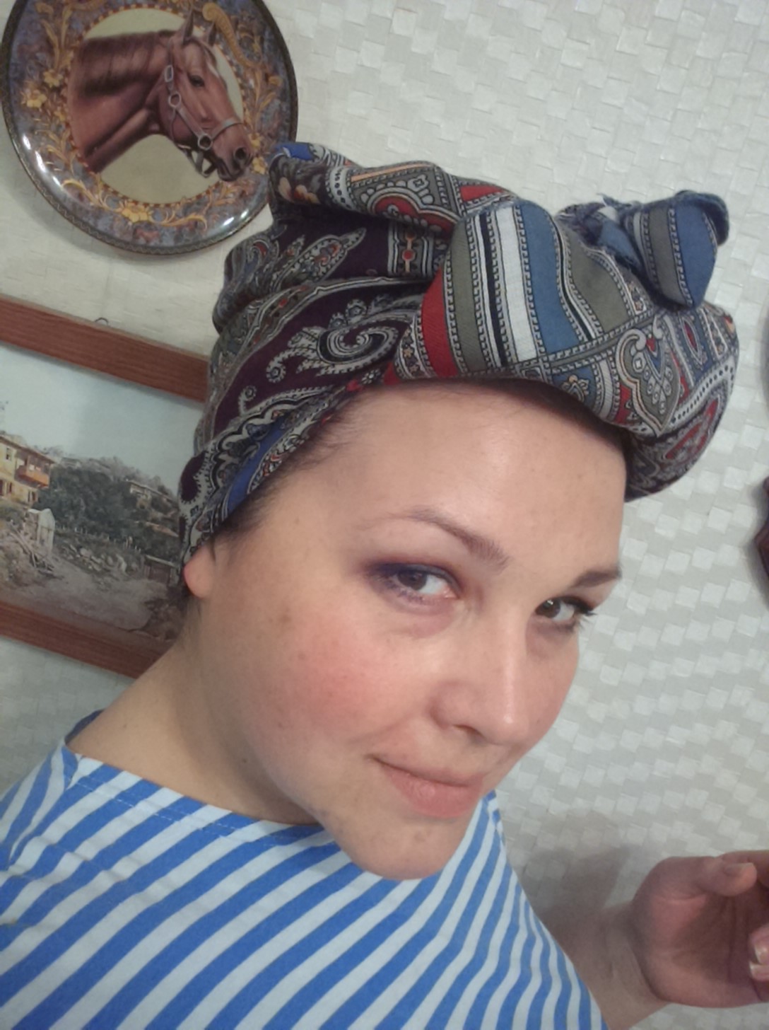 Покажу, как я ношу платки на голове, это практикую летом. В первую очередь очень удобно. Во вторую - если идёт, то и красиво ;) (мужу моему не нравится, а мне очень :D )