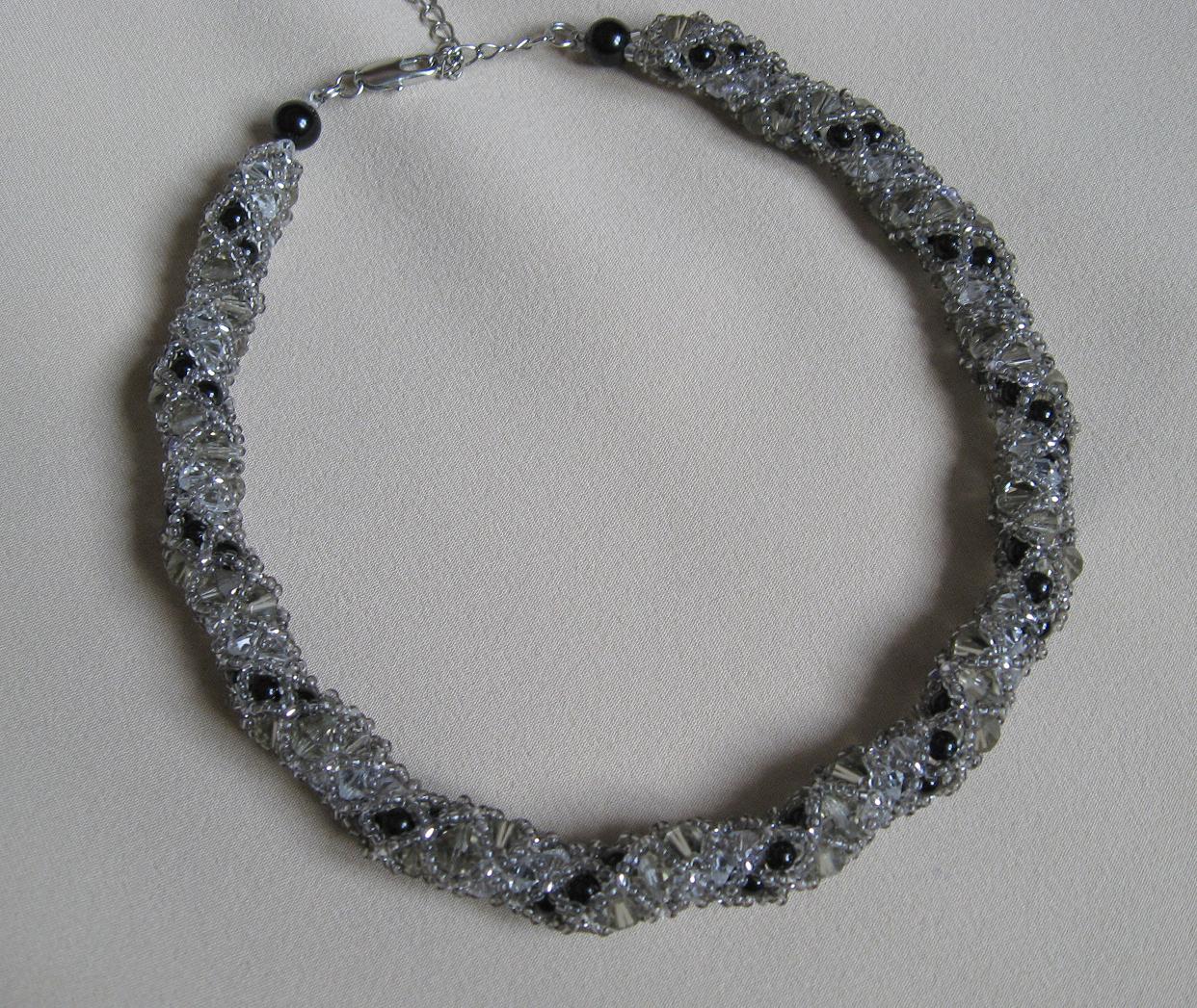 Eva, это плетеный жгут с бусинами. Его довольно трудно фотографировать - стеклянные биконусы бликуют, а я, к сожалению, не сильна ни в фотографировании, ни в фотошопе