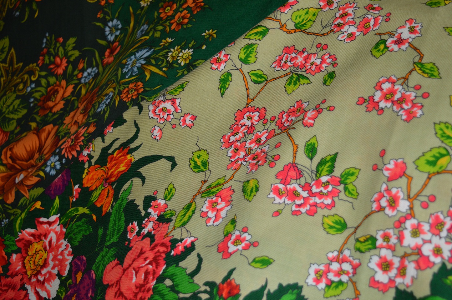 Еще один старинный рисунок Розы и Пионы, восстановлен Виктором Зубрицким. Справа - мое последнее приобретение. Слева - ручная набойка из Марининой коллекции.