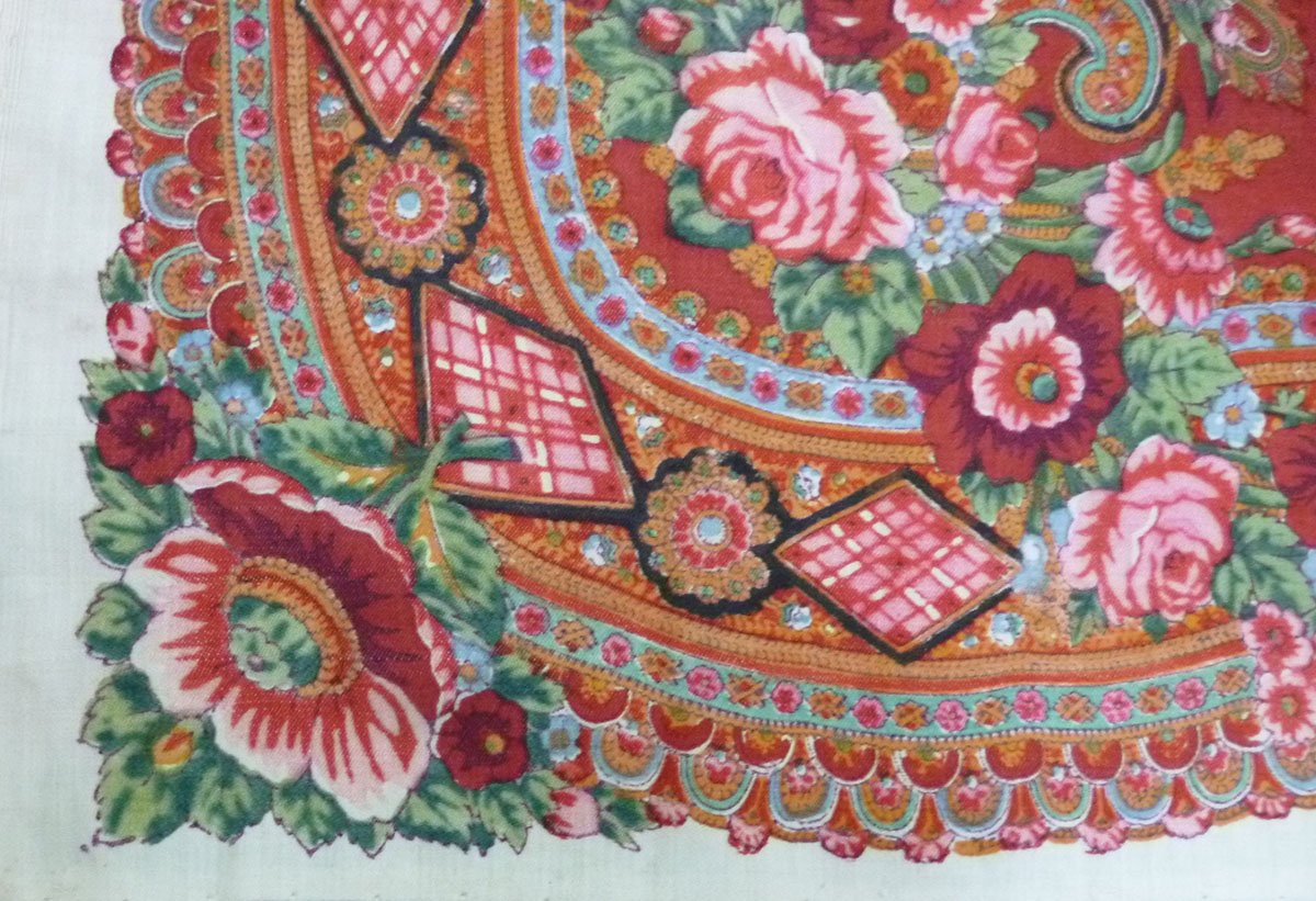 Колорит 1: кремовый_Колорит 1 Колорит 1_Колорит 1 Колорит 4: красный_Колорит 4_Колорит 4_Колорит 4_Колорит 4 Старинная шаль конца XIX в. Ручная набойка на тонкой шерсти с шёлковыми просновками. Клеймо фабрики Штефко.