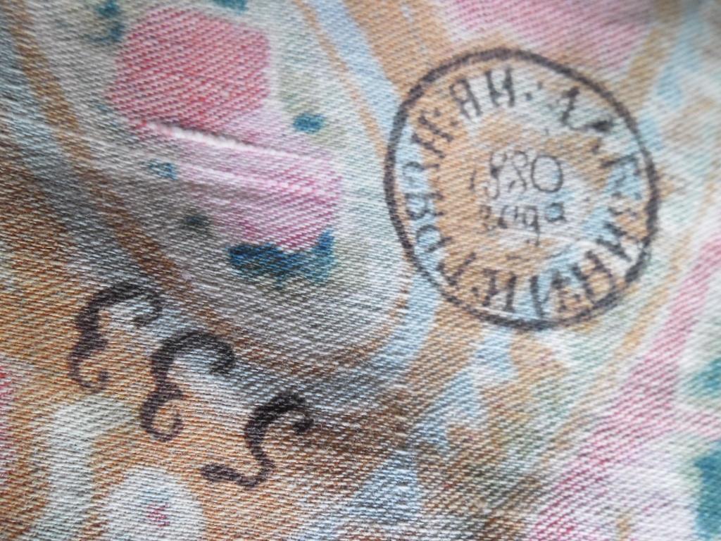Старинная шаль конца XIX в. Ручная набойка на тонкой шерсти с шёлковыми просновками. Клеймо фабрики Штефко.