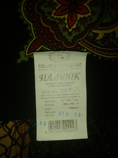 Информация про вшитые тканевые бирки от неизвестного производителя (предположительно, чешского) уже была на форуме. Сегодня мне прислали фотографию подобной бирки на шали с популярным рисунком У САМОВАРА