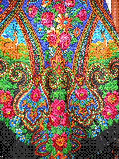 Куплена уже более месяца назад, тогда много шалей на Вернисаже одновременно вспыло (90-х гг). Есть еще..но только что поставленные аккумуляторы в фотоаппарате неожиданно разрядились. Показать не могу.