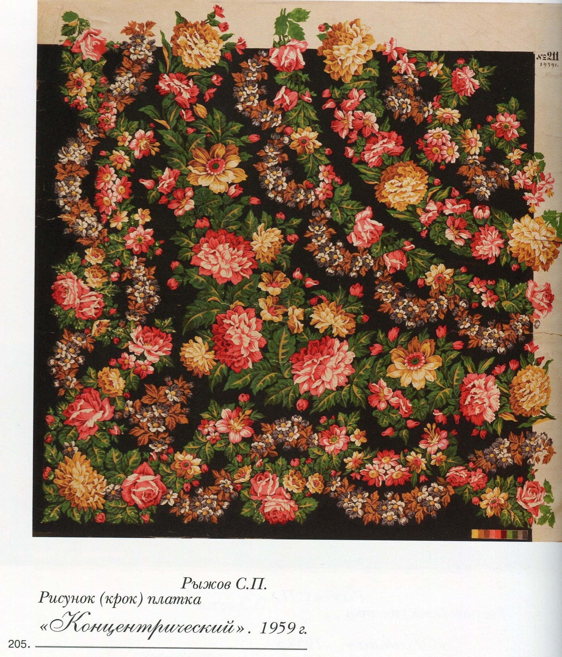 "В 1965 году на фабрике имени Х годовщины Красной Армии способом фотофильмпечати выпускали платок Рыжова "Четыре праздника": черный грунт, четыре угла, в каждом разные цветы - маки, георгины, розы и сирень" ( А. Коновалов. Плат узорный. М. 1981, с.104).
