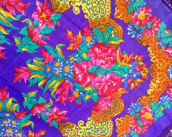 Шаль 150х150 с круговым цветочным мотивом с букетами тюльпанов и русским резным орнаментом