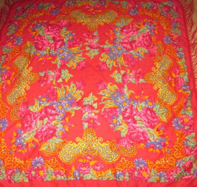 Шаль 150х150 с круговым цветочным мотивом с букетами тюльпанов и русским резным орнаментом