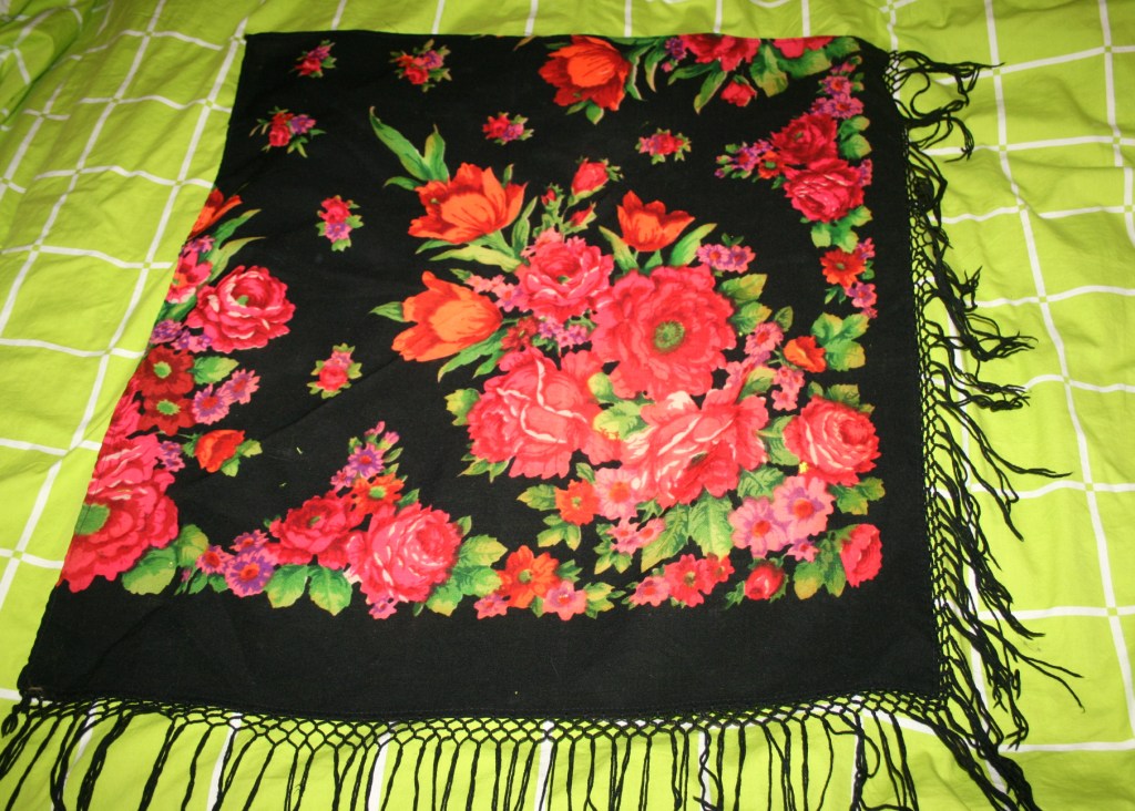 Вот, кстати, платочек Майского утра похоже из той же фабрики где голубая этикетка - стиль расположения рисунка нетрадиционный для ПП и бахрома из клеток в три ряда на малом размере...