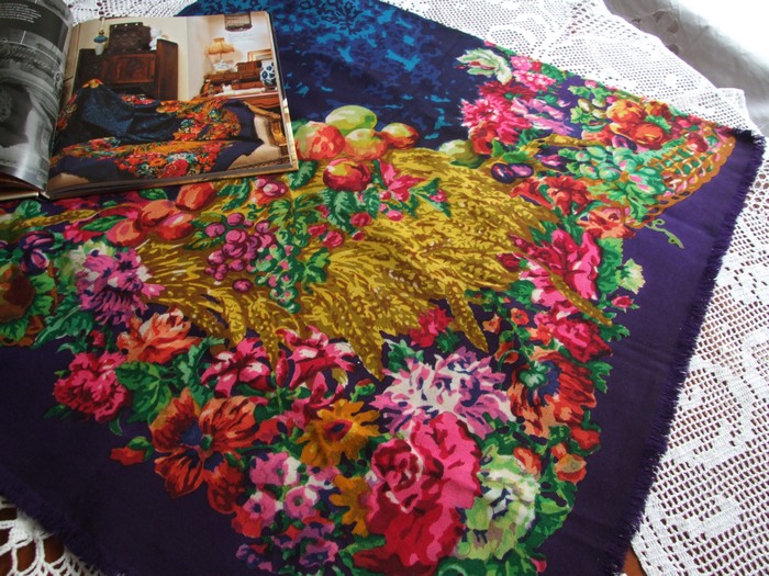 Я, конечно, видела фото скатерти "Урожай" и в предыдущей книге Н.В. Толстухиной и Т.А. Полосиновой "Павловопосадские шали", но там она не цепляла. И вдруг, первый раз листая альбом М. Колевой "Романс о павловопосадской шали", я вдруг обомлела от шикарного фото с этой скатертью. Только ради него купила себе эту книгу.