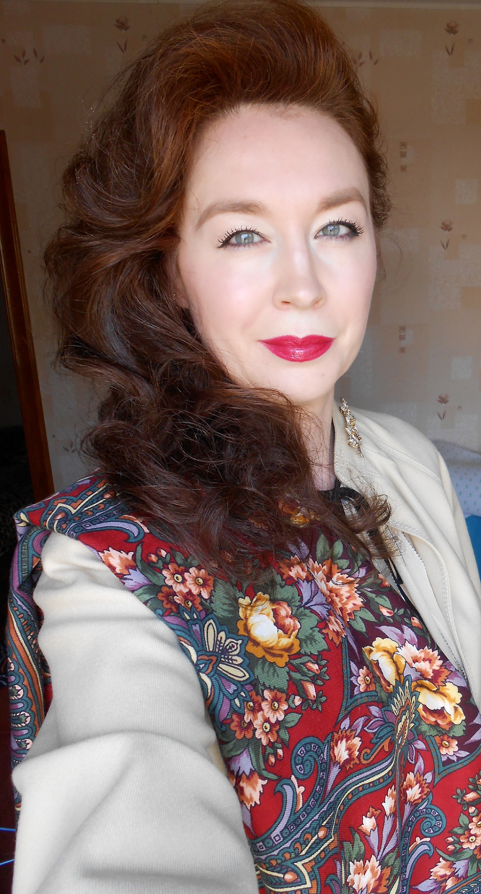 Елена Х,"У самовара" как тут и был,всё гармонично по цвету:шаль,плащ,колечко.Хороша!
