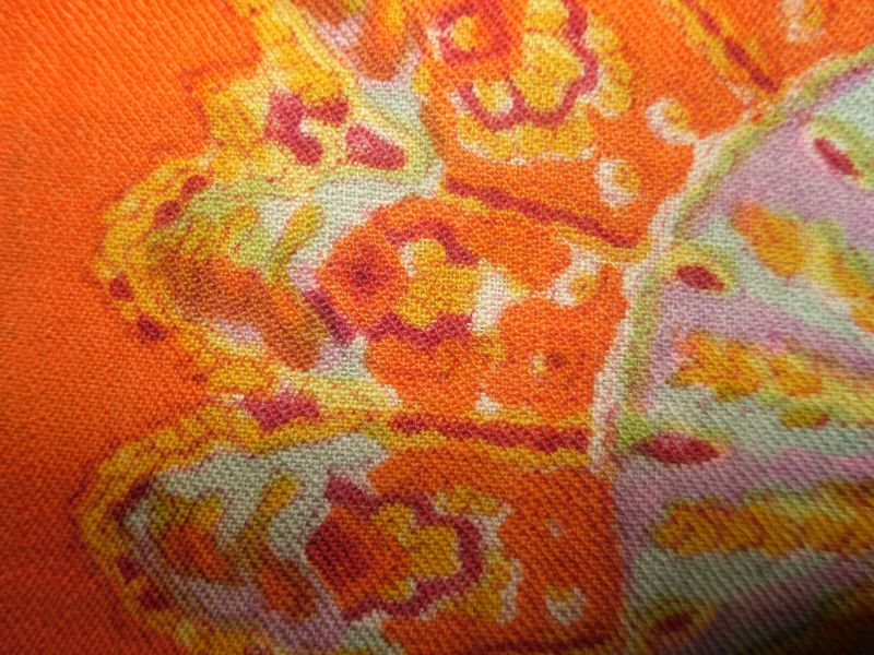 Скатерть шерстяная, квадратная, размером 150х150 см. Ткань имеет полотняное переплетение, шерсть плотная, из тех тканей о которых говорят, что они "держат форму". Рисунок очень красочный, набит вручную.