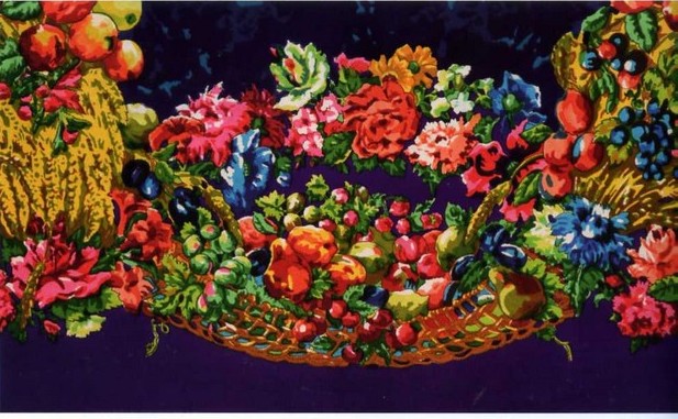 Рисунок построен по типу каймы, где содержимое одной корзины, расположенной по середине каждой стороны скатерти, плавно перетекает в другую корзину: цепочка снопов, фруктов, цветов, листьев. Груши (зеленые и рыжие), яблочки, сливы, вишни, виноград - чего там только нет! И цветы - в углах скатерти, и над корзинками - это гирлянда, обвивающая корзины. Вобщем - пир для глаз, рассматривать можно долго... и считать количество использованных красок.