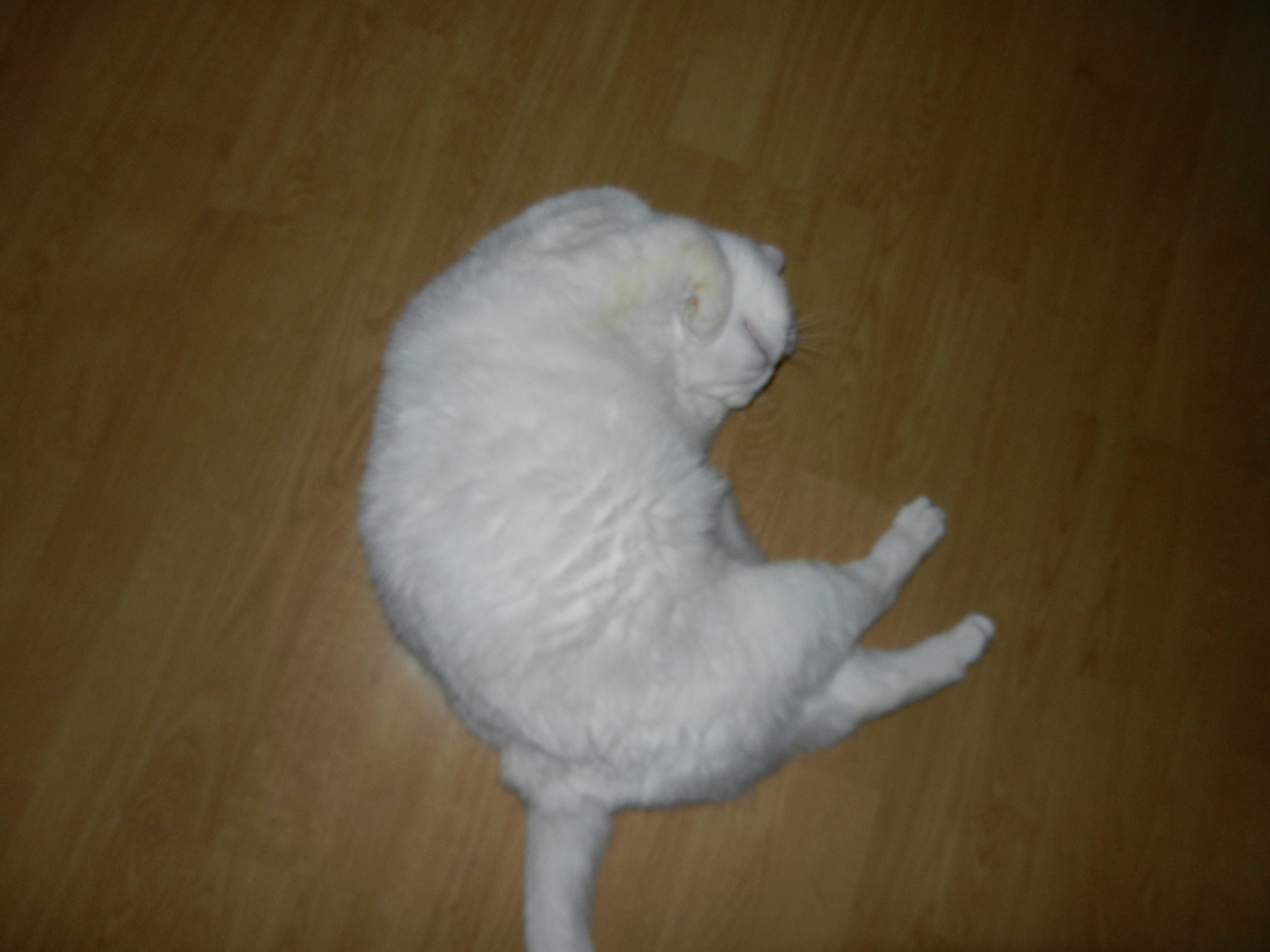 На боку или спине, это у нее любимая поза, и лапки так умильно сложит