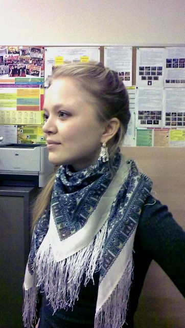 Подруга купила подвеску-оберег с оленями, я серьги (на фото). Подумали: с какими шалями сочетать это чудо? Украшения яркие, национальные (причем другой национальности), сложно. На фото -- попытка примирить якутские серьги с "Февралем". Пока платки Татьяны Сухаревской кажутся лучшим сопровождением для таких цацек. А вы что скажете, уважаемые дамы?