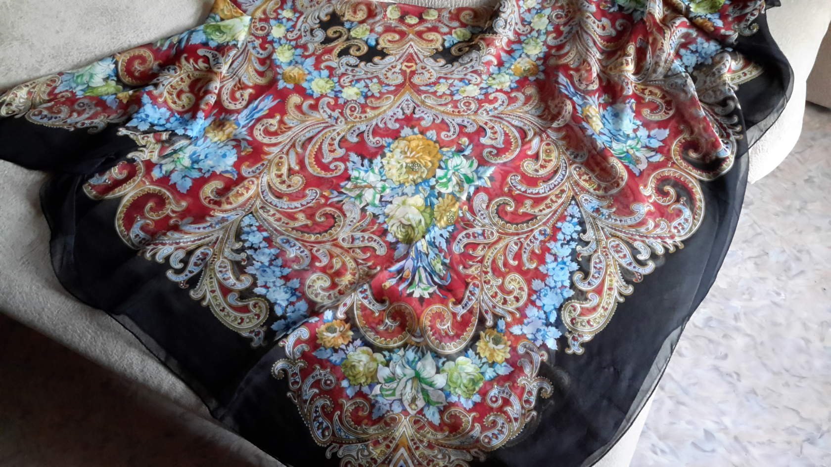 Здравствуйте! Решилась внести свою лепту. Размещаю фотографию платка (подделки), с которого, собственно говоря, началось мое увлечение павловопосадскими платками. Промозглой осенью мне вдруг захотелось иметь теплый платок. Продавщица, уговаривая меня купить этот платок, горячо убеждала, что он настоящий. Поддалась уговорам и купила, а дома нашла в интернете сайт настоящих платков и все поняла. Не сразу разглядела рисунок , пока не сфотографировала. Качество фотографии плохое, но рисунок разглядеть можно.