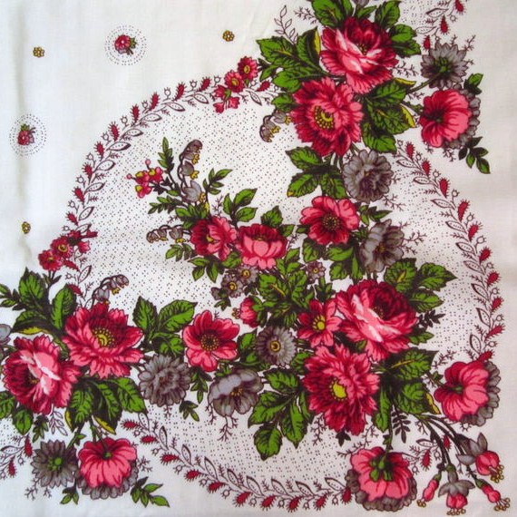 Шаль 146х146 с букетами тюльпанов и ягодами малины по кайме_Экспертиза 15.11.15